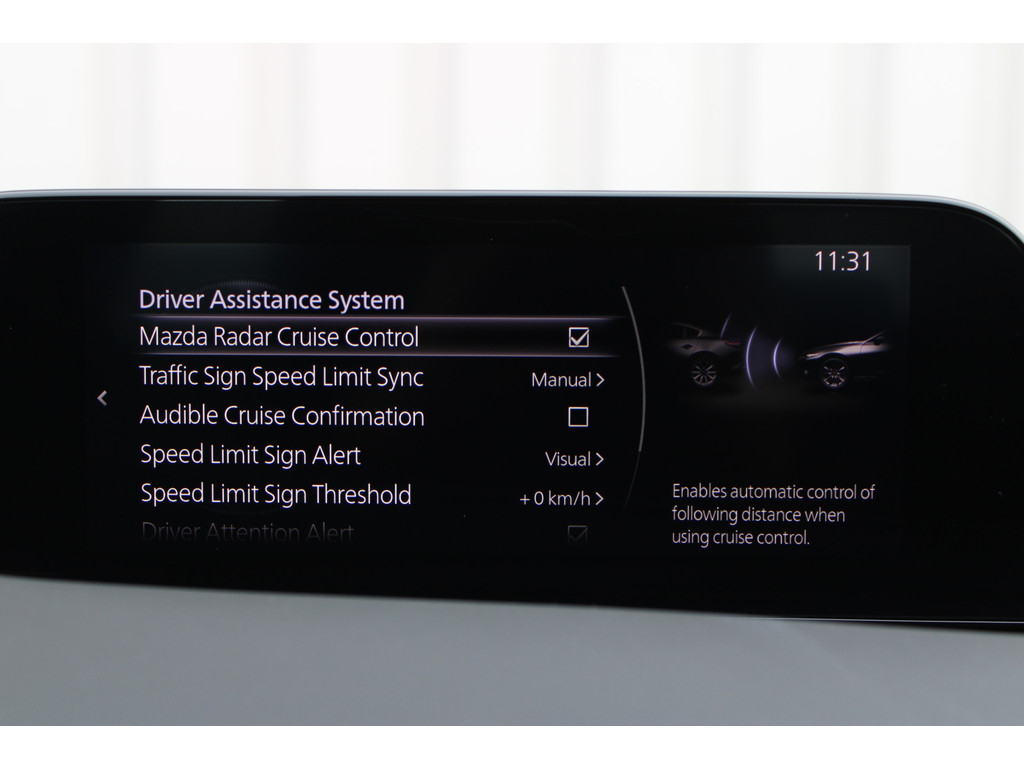 Adaptive cruise control houdt de ingestelde snelheid vast en houdt automatisch afstand tot uw voorligger. Met uw smartphone maakt u overal contact met de auto. Remote services geven direct inzicht in uiteenlopende functies en zijn op afstand te activeren. Het is veiliger om altijd uw ogen op de weg te houden en uw handen aan het stuur; daarom is dit voertuig uitgerust met een audiosysteem met DAB-ontvangst en een audio-navigatiesysteem dat kan worden bediend via het stuurwiel of spraakbediening. Liever gepiep dan gekraak? Dan zult u blij zijn met de aanwezige parkeersensoren! Het drukke verkeer eist onderweg al uw aandacht op. Daarom is het goed dat deze Mazda is voorzien van diverse systemen die u assisteren tijdens de rit. Een automatisch inschakelbare verlichting neemt het waar als het donker wordt of gaat schemeren, en schakelt dan automatisch de verlichting in. Op dezelfde manier "ziet" de regensensor de eerste spatjes regen en schakelt dan de ruitenwissers in, en als het harder gaat regenen zet hij de ruitenwissers ook in een snellere stand. Ook is de Mazda uitgerust met: airconditioning, lederen stuur, isofix-aansluiting, centrale deurvergrendeling met afstandsbediening, boordcomputer en lederen versnellingspook.