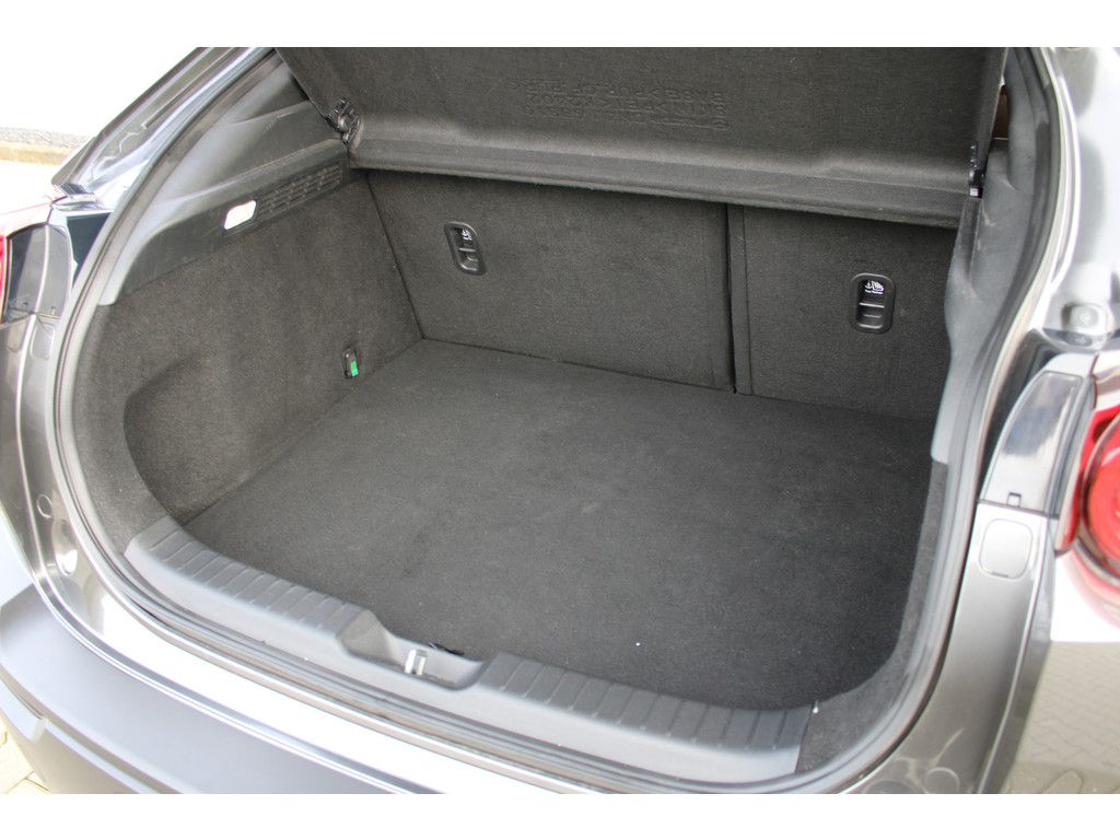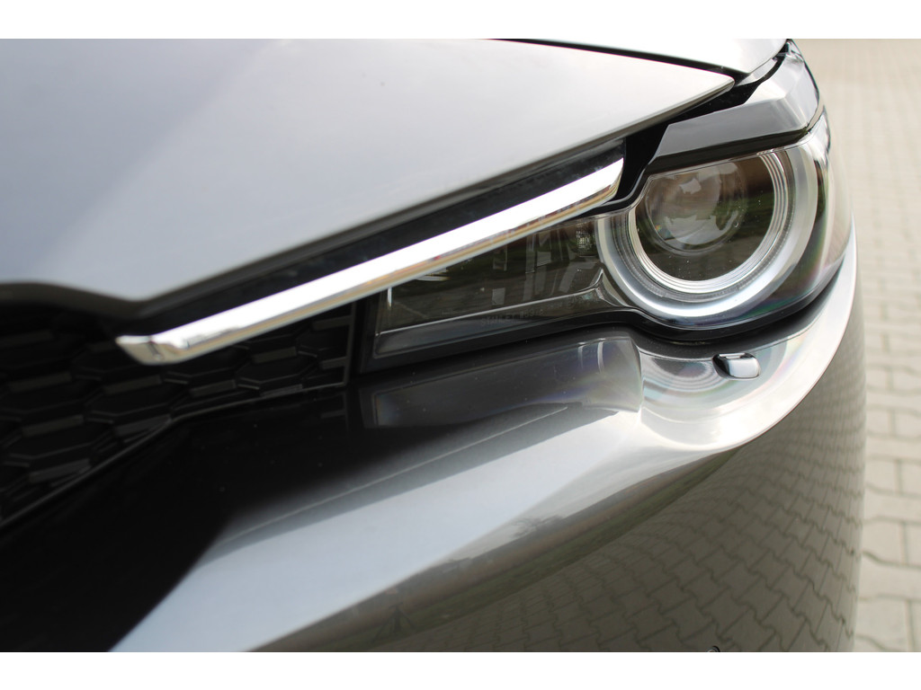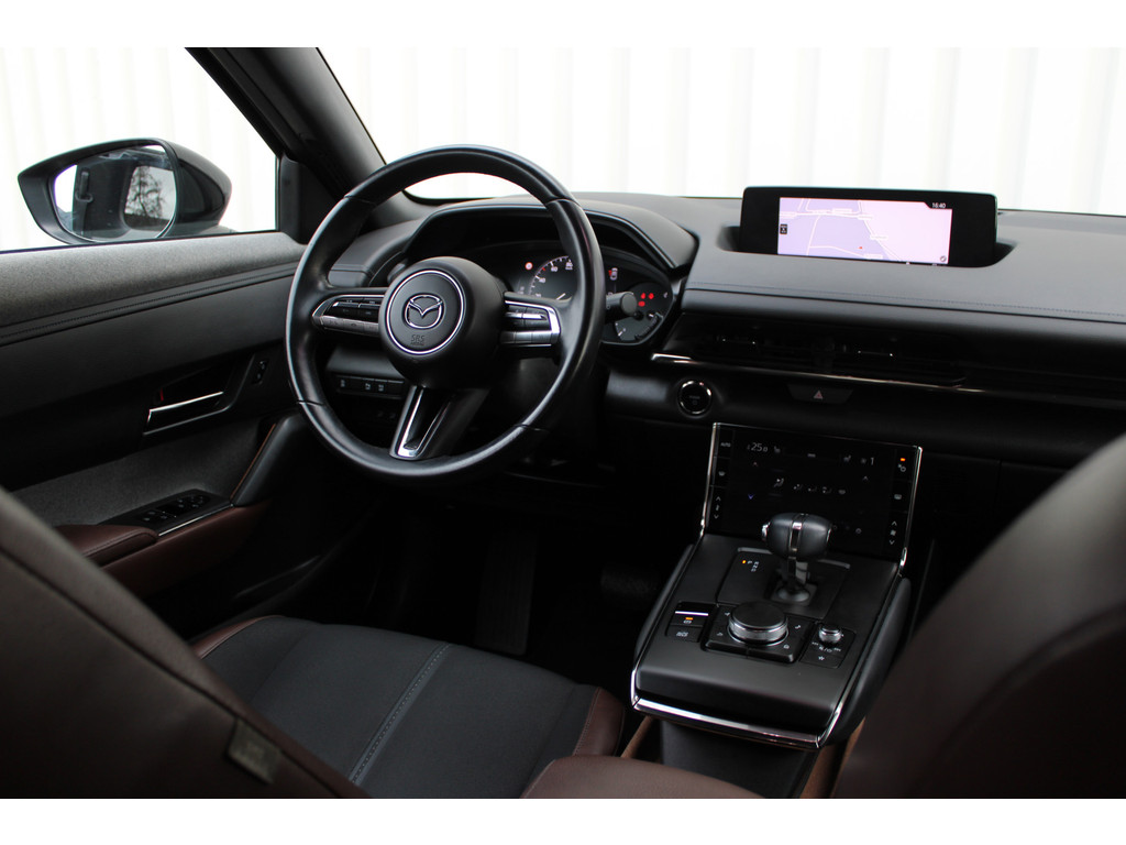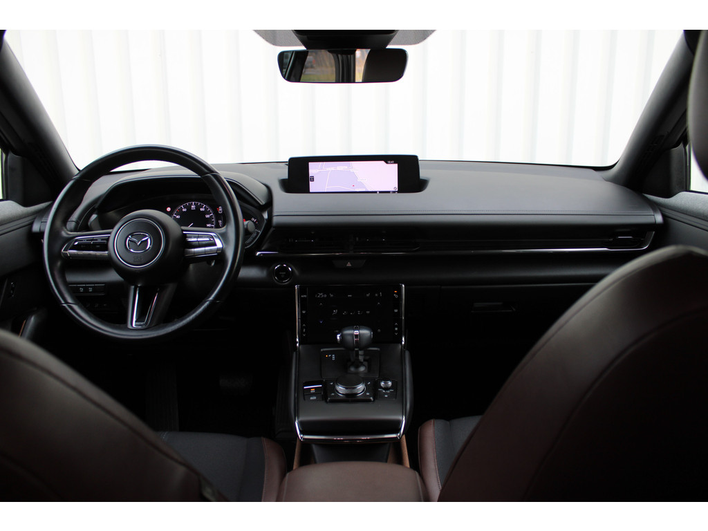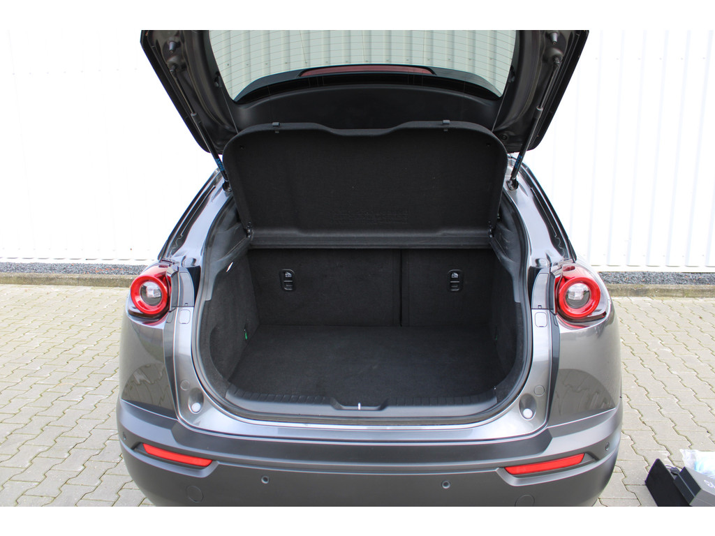 Wat ook opvalt, is de strakke en overzichtelijke informatie die het digitale dashboard levert. Kommaar-kommaar-kommaar, aldus de achteruitrijcamera. Iedere centimeter vrije ruimte komt haarscherp in beeld. Schadevrij inparkeren maar! Met adaptive cruise control houdt de auto zelfstandig afstand tot uw voorligger. Een veiligheidsverhogende optie waarmee u comfortabel onderweg bent. Uw smartphone is tegenwoordig de sleutel tot heel veel. Ook voor deze auto. Remote services, noemen we dat. Waar u ook bent, contact houden is een eitje. In deze MX-30 vindt u schakelaars op het stuur om het navigatiesysteem te bedienen en het audio-installatiesysteem met DAB-ontvangst. De Mazda is standaard voorzien van: kruisend verkeer detectie, automatische airconditioning, regensensor, automatisch dimmende binnenspiegel, isofix-aansluiting en centrale deurvergrendeling met afstandsbediening.