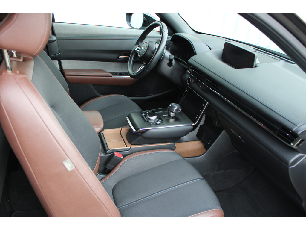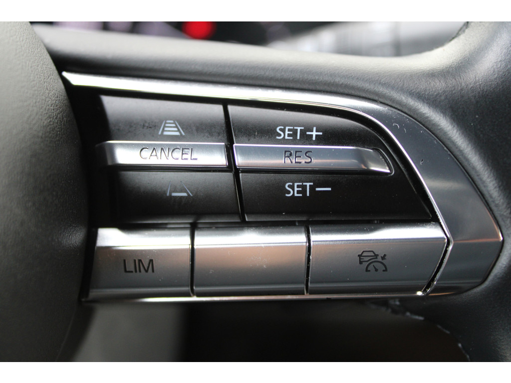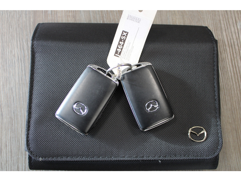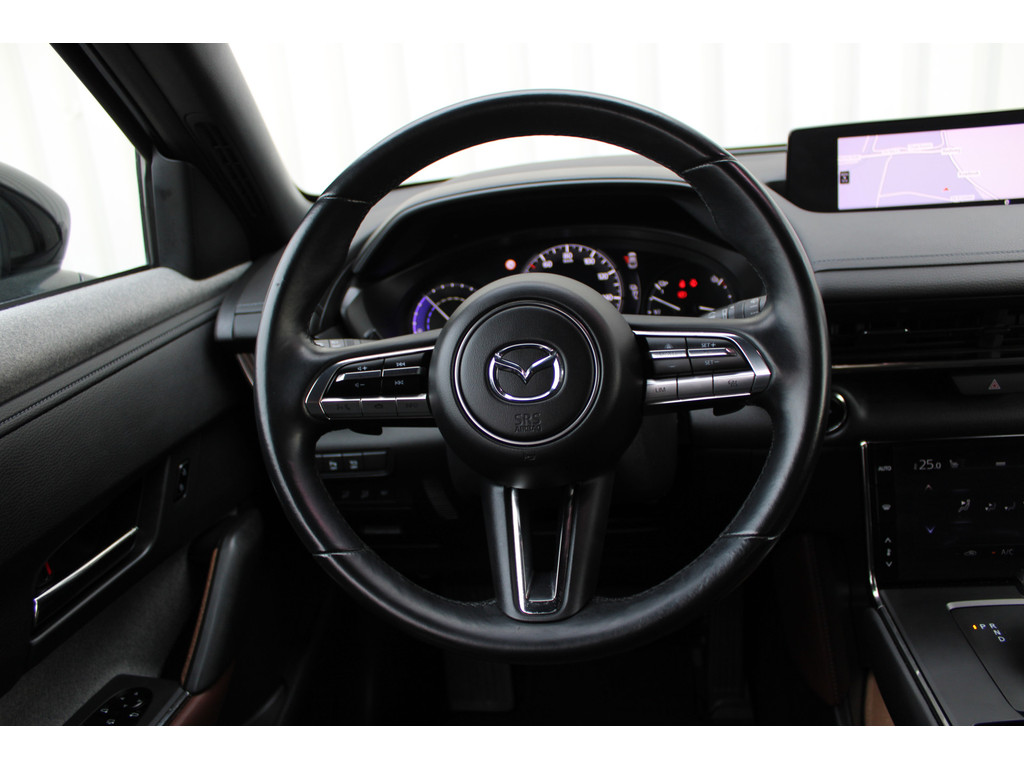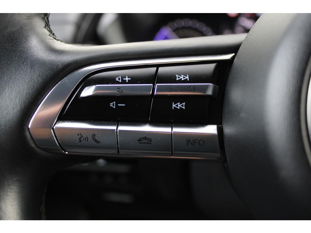 Wat ook opvalt, is de strakke en overzichtelijke informatie die het digitale dashboard levert. Kommaar-kommaar-kommaar, aldus de achteruitrijcamera. Iedere centimeter vrije ruimte komt haarscherp in beeld. Schadevrij inparkeren maar! Met adaptive cruise control houdt de auto zelfstandig afstand tot uw voorligger. Een veiligheidsverhogende optie waarmee u comfortabel onderweg bent. Uw smartphone is tegenwoordig de sleutel tot heel veel. Ook voor deze auto. Remote services, noemen we dat. Waar u ook bent, contact houden is een eitje. In deze MX-30 vindt u schakelaars op het stuur om het navigatiesysteem te bedienen en het audio-installatiesysteem met DAB-ontvangst. De Mazda is standaard voorzien van: kruisend verkeer detectie, automatische airconditioning, regensensor, automatisch dimmende binnenspiegel, isofix-aansluiting en centrale deurvergrendeling met afstandsbediening.
